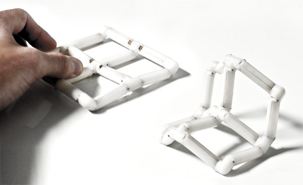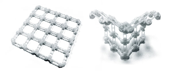 The Self-Folding Sheets prototypes demonstrate 2D to 3D self-reconfiguration with embedded folding instructions and passive energy input. Various energy sources and mechanisms have been tested from mechanical latching, magnetics to elastic systems. A variety of 3D structures have been tested and demonstrate self-reconfiguration from standard 2D sheets. The vision of this research is to create universal flat sheets that can self-assemble into rigid 3D structures with random external energy, rather than guided folding strategies. Future applications look to expand the possible range of 3D shapes and increase the scale of self-assembly for larger architectural structures.