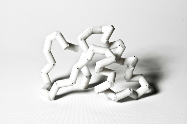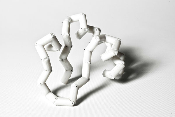 The Self-Folding Proteins are single strands of material with embedded fold-angles that when thrown into the air randomly, self-assemble into the 3D structure of the desired protein. This project aims to study macro-scale protein folding to gain insights into non-intuitive and non-tangible aspects of self-assembly phenomena. The Crambin Protein has been utilized due to its well-studied characteristics and minimal size. This technology appears to be scaleable to larger protein strands and other 1D to 3D self-assembly systems. Further developments will include cross-linking and hierarchical folding with weighted folding sequences.