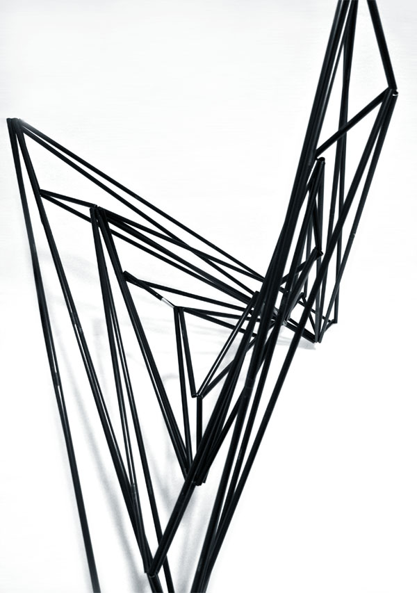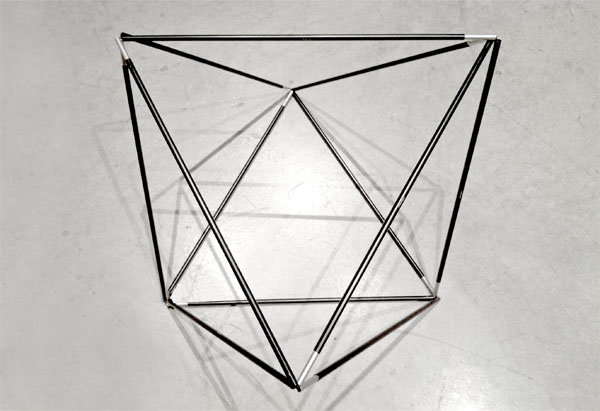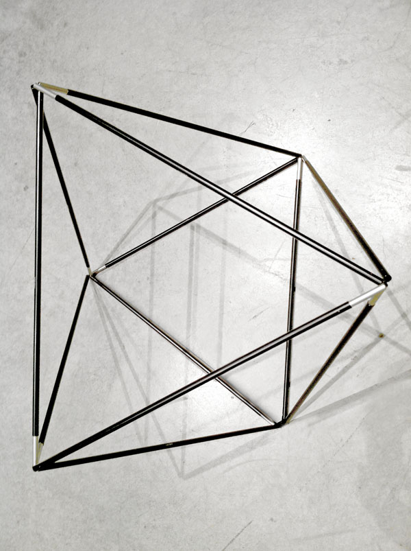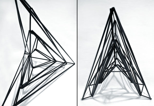 A collaboration with Erik and Marty Demaine, the Single-Strand Structures are a series of prototypes looking at building structures with only a single line. Tent poles provide a cheap and quick assembly kit for constructing complex geometry with universal joints. These prototypes follow in a line of research on programmable matter and deconstructing complex geometry into single strand sequences of fold instructions, much like our Ribosome’s decoding of RNA into fold sequences of complex proteins. The Single-Strand Structures similarly ease assembly with a single instruction sequence and allow for fast shipment and deployment of large structures. The assembly kit offers a universal joint for complex vertices of any degree, while also creating a universal hinge, perfect for rigid origami structures. The Hypar surface was constructed from a single 75' chain of tent pole segments with a tension cord threaded throughout the entire length.