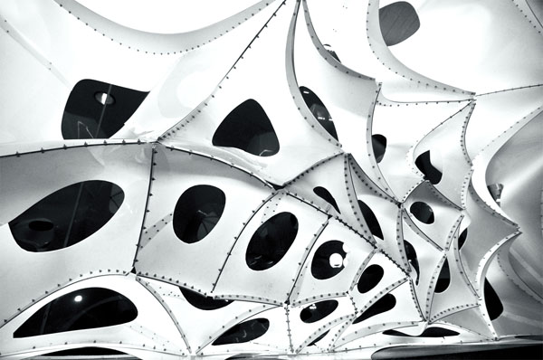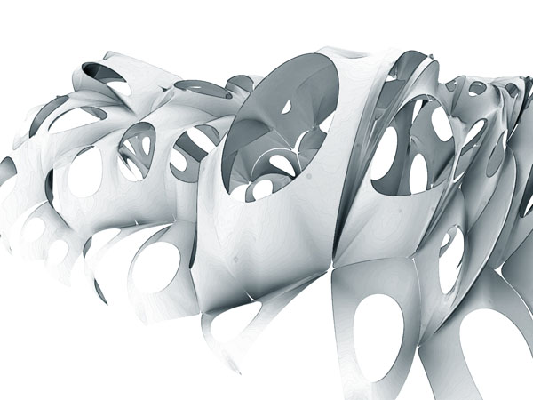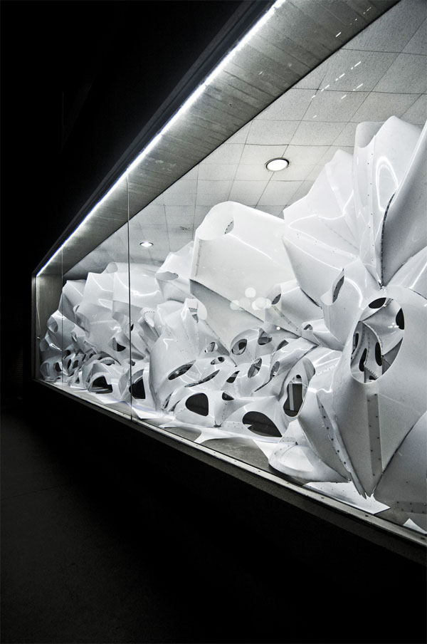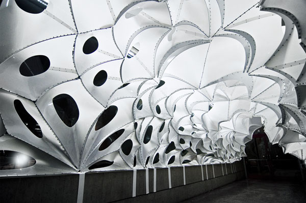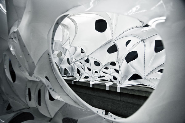 VoltaDom, by Skylar Tibbits - for MIT's 150th Anniversary Celebration & FAST Arts Festival (Festival of Arts, Science and Technology) - is an installation that populates the corridor spanning building 56 & 66 on MIT’s campus. This installation lines the concrete and glass hallway with hundreds of vaults, reminiscent of the great vaulted ceilings of historic cathedrals. The vaults provide a thickened surface articulation and a spectrum of oculi that penetrate the hallway and surrounding area with views and light. VoltaDom attempts to expand the notion of the architectural “surface panel,” by intensifying the depth of a doubly-curved vaulted surface, while maintaining relative ease in assembly and fabrication. This is made possible by transforming complex curved vaults to developable strips, one that likens the assembly to that of simply rolling a strip of material.