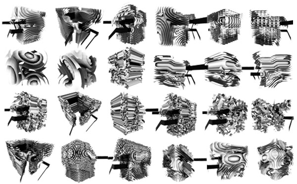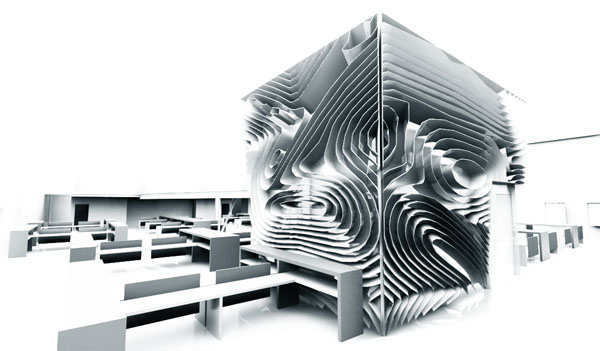"As part of a renovation and expansion of the headquarters for a design and engineering company in the medical devices industry, the pavilions serve as informal collaboration spaces within a large open office. Designed with Radlab Inc, in collaboration with Reverse Architecture, the two interior pavilions are intended as iconic anchors within the office, linking the first and second levels on the one hand, and serving to mediate between the 'working' space and the 'eating' space on the other. With two team meeting rooms in each pavilion, these semi-private spaces will be the primary nodes for collaboration. Consequently they will need to promote the kind of creative and intellectual stimulus necessary for a high level of design, research and product development. The pavilions will act as key geographic features, serving as points of departure as well as arrival. They carry a distinct 'weight', therefore, in providing a diverse range of important functions."