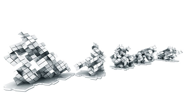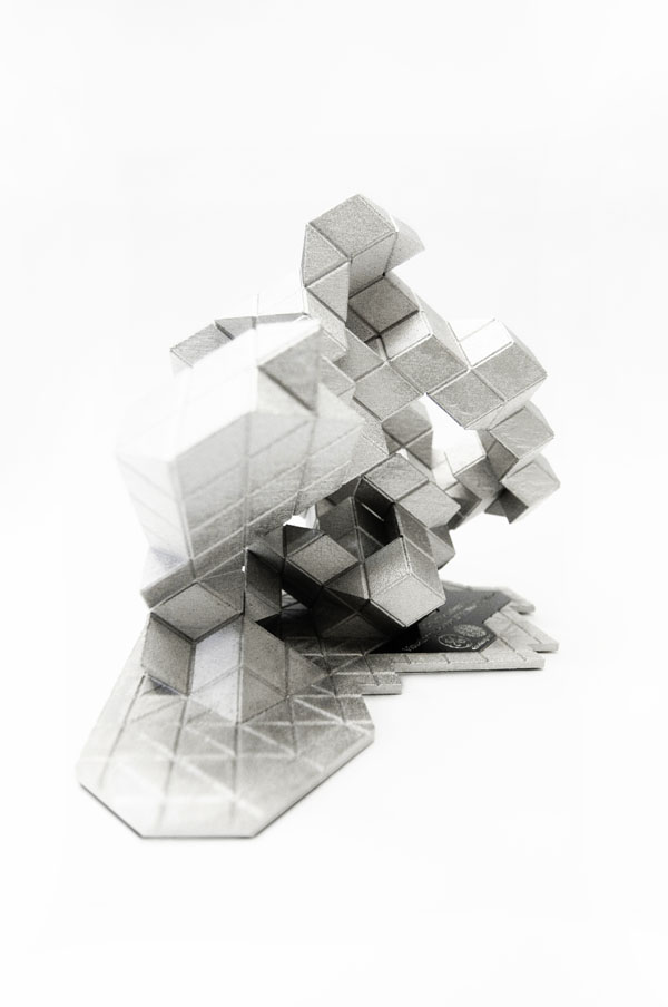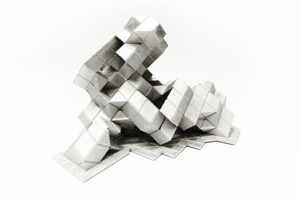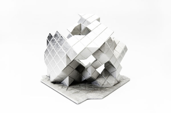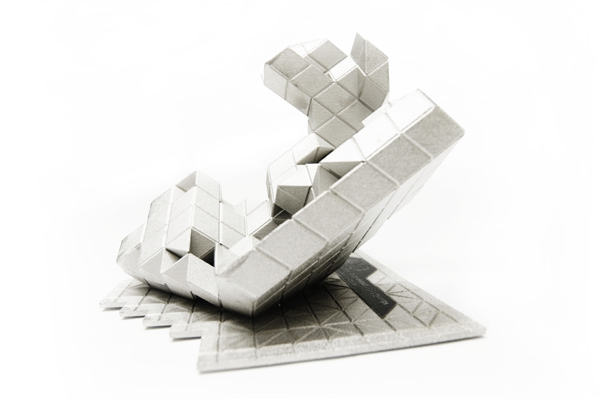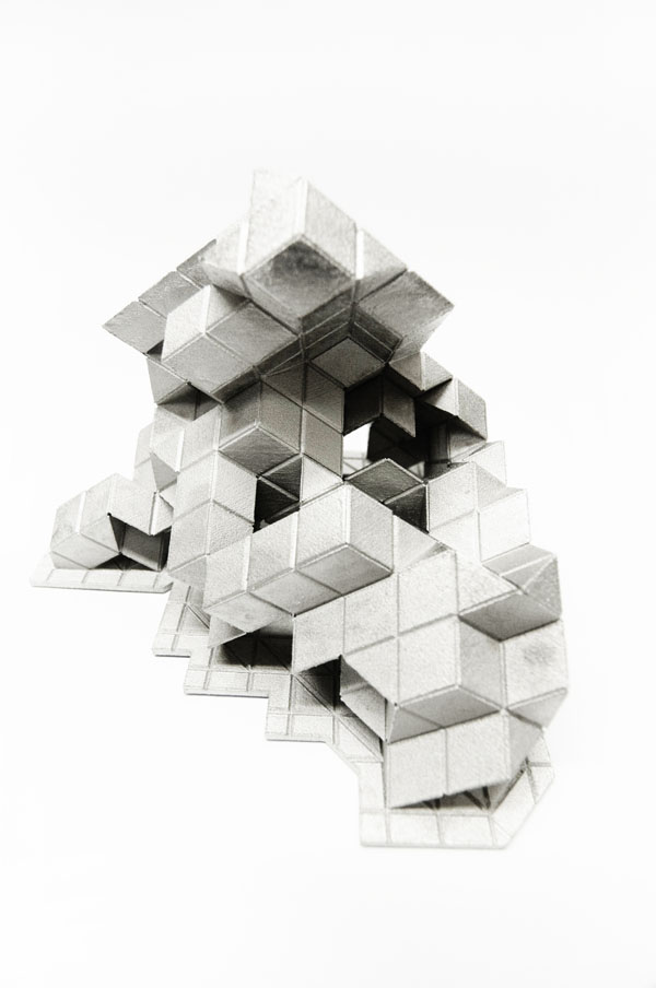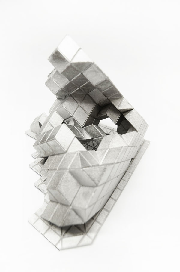 Coding [Global] Strands, by Skylar Tibbits and Jared Laucks attempts to visualize five distinct cities; Sao Paulo, Sydney, London, Berlin and New York, as individual strands weaving together, interlocking and uniting for a common scientific front. Each of the five cities has been located on the globe with respect to its relative geographic longitude and latitude. The cities then were set free to grow towards one another, never intersecting, eventually describing the globe as a whole. The resultant five single strands twist, turn and solidify to create an intricate description of the globe and the goal of collective scientific discovery. The five elements are then separated from one another and displayed as individually iconic elements – with their memory and geometry as a visual history of the five global cities and path of exploration.